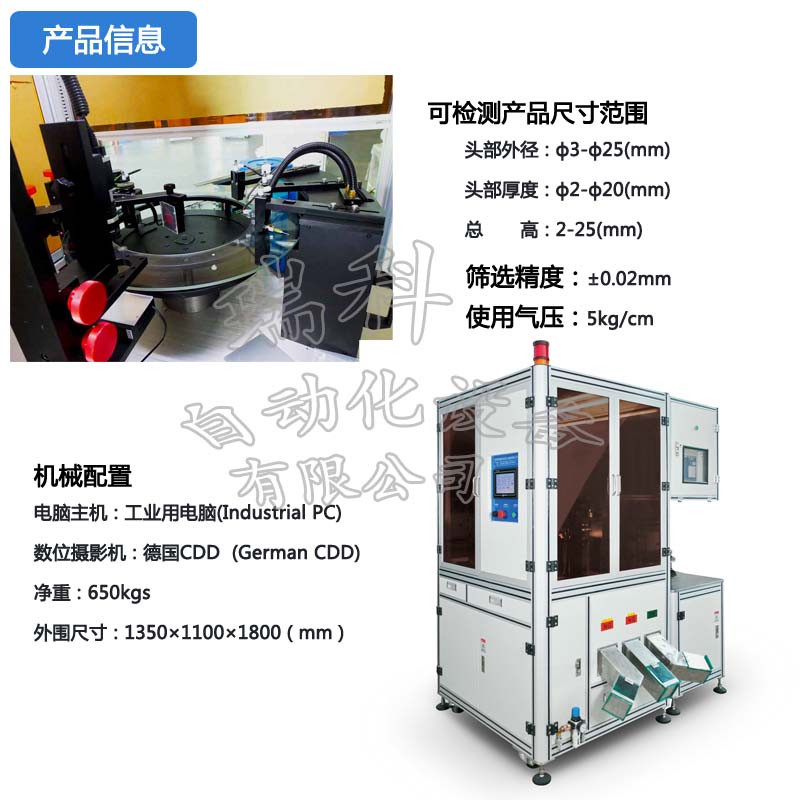 硬體配備包含振動送料機、下料軌道、檢驗平台、計算機係統為一安全、便利,且節省人力成本的自動化設備。分別介紹如下: